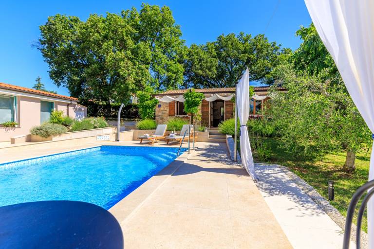 Die wundervolle Villa Morena befindet sich in der Nähe der größten Stadt Istriens - Pula. Es ist ideal für einen romantischen Urlaub für zwei Personen. Der schöne, gepflegte, eingezäunte Garten mit möblierter Terrasse und privatem Pool mit Sonnenliegen wird Sie atemlos machen. Das Haus ist schön eingerichtet, mit vielen charmanten rustikalen Details und besteht aus einer offenen, ausgestatteten Küche mit Esstisch und einem gemütlichen Wohnzimmer mit Kamin. Es gibt auch ein Schlafzimmer mit einem Himmelbett und ein Badezimmer mit Dusche. In dieser Villa ist Romantik garantiert. Kommen Sie in dieses wundervolle Ferienhaus und lassen Sie sich von den duftenden Blumen im Garten und der charmanten Atmosphäre verführen. Hier haben Sie die Möglichkeit, wundervolle Erinnerungen mit Ihren Liebsten zu sammeln und einen erholsamen Urlaub inmitten der wunderschönen mediterranen Natur zu verbringen.